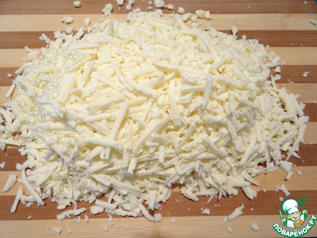 тертый на мелкой терке сыр, смешанный с мелко порезанной зеленью. Еще по